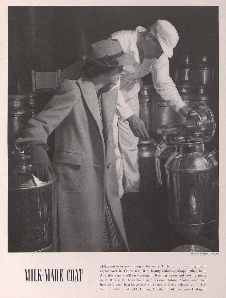 “Fashion: Milk-Made Coat.” Vogue 100, no. 3, August 1, 1942.
